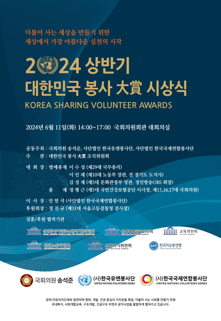 1. 2024 대한민국 봉사대상 수상자님의 무궁한 발전을 기원합니다. 2. 사단법인 한국유엔봉사단은 1970년 12월 제25차 유엔총회 결의(제2659호)에 의거하여 1971년 4월 국무회의에 상정, 9월 외무부 제78호 의거, 설립되어 사회공익사업을 활발히 전개하고 있는 50년 전통을 가진 대한민국 최고의 사회봉사단체입니다. 3. (사)한국유엔봉사단은 아름다운 사랑의 봉사와 따뜻한 나눔 문화를 실천해 오신 분들을 격려하고 전 국민의 가슴속에 사랑의 봉사와 나눔의 문화를 전달하여 풍요로운 국가를 건설하기 위하여 2010년부터 “대한민국 봉사대상 시상식”을 진행하고 있습니다. 나눔과 봉사 문화를 우리 사회에 더욱 확산시키기 위한 "2024 상반기 대한민국 봉사 大賞 시상식”을 다음과 같이 개최하고자 합니다. 4. 제출하신 공적조서를 심의한 결과 다음의 수상이 결정되었음을 알려드리며, 「2024 상반기 대한민국 봉사 大賞」수상을 진심으로 축하드리고, 당일 참석해 주시기 바랍니다. 가. 수상1 : 「2024 상반기 대한민국 봉사 大賞」 나. 수상2 : 국회 각 분과위원회 위원장 상 및 기관장 상 등 ◆ 다 음 ◆ 1) 행 사 명 :‘2024 상반기 대한민국 봉사 대상 시상식’ 2) 일 시 : 2024. 6. 11.(화) 14:00-17:00 3) 장 소 : 국회의원회관 대회의실 (서울특별시 영등포구 의사당대로 1) 4) 참가인원 : 약300명 내외. 끝. ※ 수상자님께서는 참석인원을 5/31(금)까지 아래의 연락처 혹은 ( awards@unv.or.kr )로 알려주시기 바랍니다.