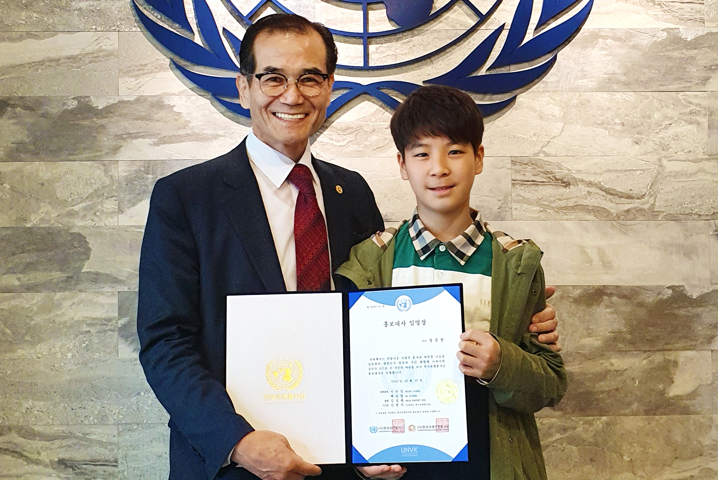 한국유엔봉사단에서 지난 19일 트로트 가수로 활발히 활동중인 가수 정동원군을 홍보대사로 위촉하는 시간을 가졌습니다.